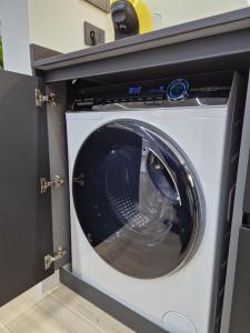 The apartment includes two bedrooms with two beds in total, a living room with a seating area and sofa, as well as two bathrooms equipped with showers and bidets. Guests have access to ironing facilities including an iron and board, towels, synthetic non-feather pillows, heating, tile flooring, clothes drying rack, dressing room, washing machine and air conditioning.